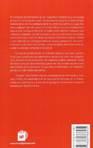 El compost de lombrices es un magnífico material que se puede producir con facilidad a partir de productos orgánicos desechables (restos de la cocina, residuos agrarios, estiércol, cartón…) y que mejora cualquier tipo de suelo. La lombricultura es una actividad ecológica que consigue retornar al suelo unos aportes valiosos, que mejoran cualquier tipo de sustrato y ayuda a disminuir la presión de los residuos sobre el medio ambiente. Este libro trata en detalle y con claridad los principios básicos para la generación de vermicompost tanto para una familia como actividad educativa en la escuela o a escala comercial e industrial. La cría de lombrices es un método sencillo, racional y económico que constituye una alternativa valiosa a la continua degradación, erosión y contaminación de nuestros suelos. Aprender cómo se hace compost de lombrices puede ser útil a todas las personas interesadas en la jardinería, la agricultura sostenible y el cuidado y protección del medio ambiente. El autor, José Ramón Alonso, investigador en Alemania y Estados Unidos, es catedrático en la Facultad de Biología de la Universidad de Salamanca y autor de la agroguía Cómo hacer compost editada por Mundi-Prensa.